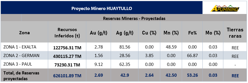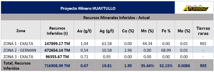 - Los valores presentados en el cuadro de recursos minerales medidos e inferidos (Actual) fueron calculados con los datos recogidos durante los trabajos de cateo y prospección minera avanzada realizados en las tres zonas de nuestro Proyecto Minero HUAYTULLO. Estos cálculos consideran aspectos geológicos, topográficos, geoquímicos, mineralógicos, y reportes de laboratorio que incluyen análisis de mineral.